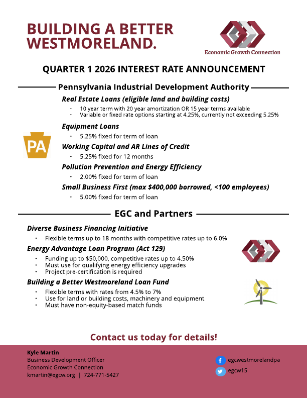 The Pennsylvania Industrial Development Authority announced its quarterly interest rates for Q1 2026! Qualifying applications submitted between January 1st and March 31st may be eligible. Contact Kyle Martin at kmartin@egcw.org today if you are interested in discussing project financing.